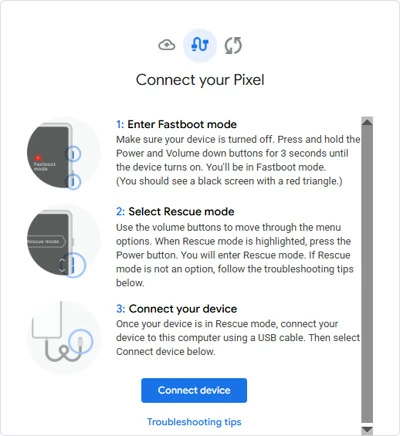 If your Pixel phone cannot be successfully recognized, click the "The device is connected but not recognized" link and follow the instructions to place your phone into a special mode.