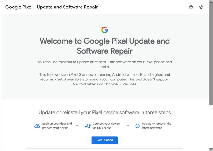 1. On your computer, open a Chrome browser and visit the official Google Pixel Repair Tool website. Click Get Started to begin.