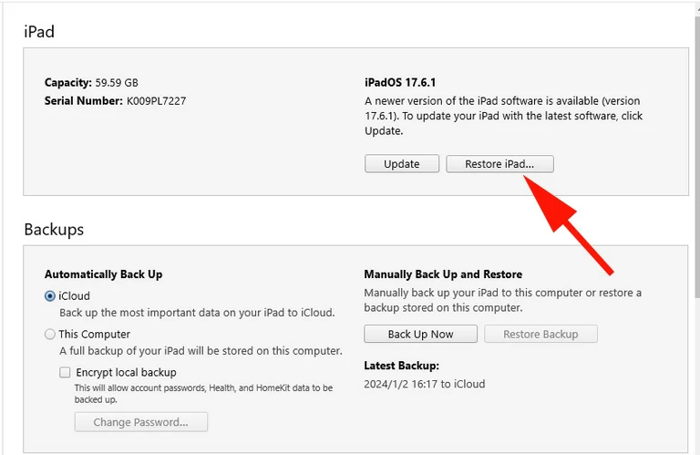 Note that an iTunes erase done through Restore iPad feature is quite the same as a reset from Recovery mode. Either way will delete all of your data and settings, allowing you to set the iPad up again. During the setup process, you can restore your earlier backup to your iPad.