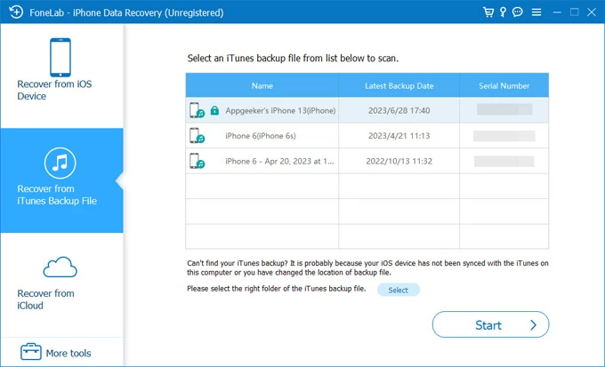 2. Select a backup where your completely deleted messages are stored in and click Start button to scan your backup archive.