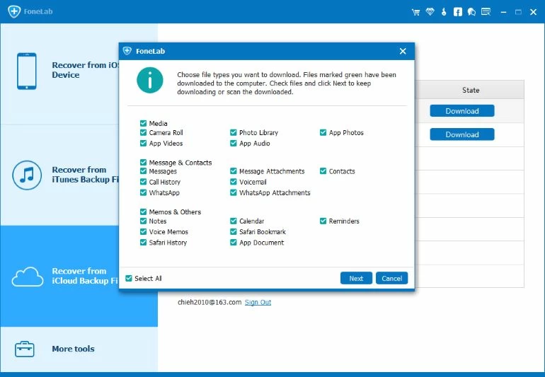 2. Select the correct iCloud backup. The panel will display the backups archived in the account, select the backup containing the messages you want and click Download.