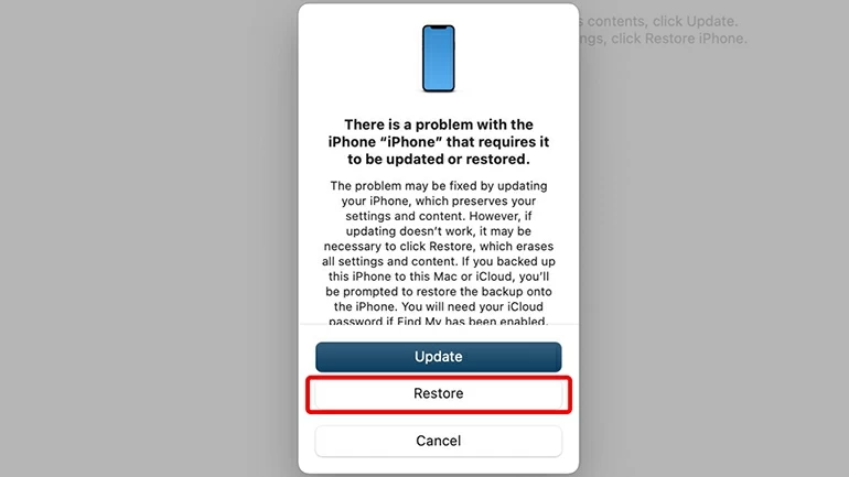 4. When iTunes or Finder detects your locked iPhone 14, it should give you a prompt to update or restore your iPhone.