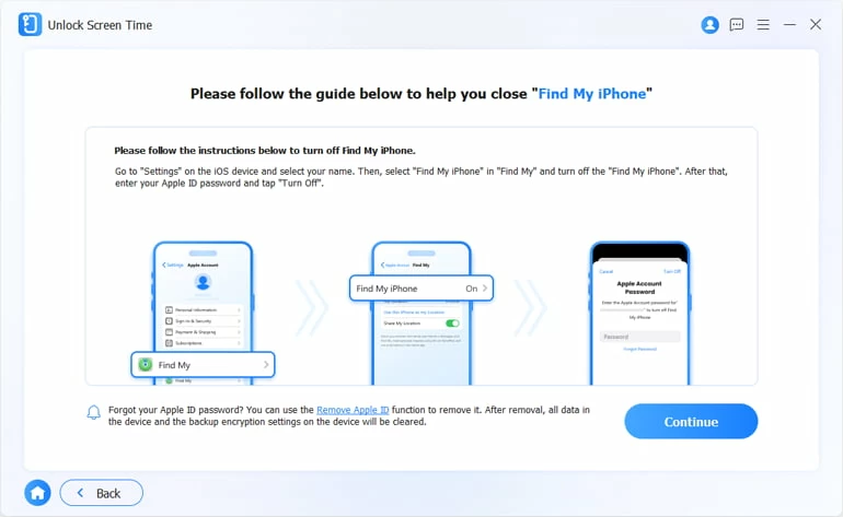 5. When everything is ready, click "Continue" to begin unlocking your Screen Time on iPhone without passcode. When your iPhone restarts, follow the on-screen instructions to set up your device.