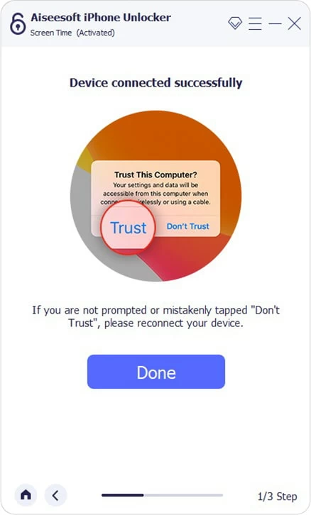 Step 2. Connect iPhone. Use a USB cable to connect the iPhone which you want to reset Screen Time passcode for; if prompted, tap Trust on your device to allow the connection.