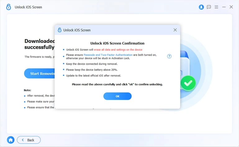 Once done, read the confirmation message, then press "OK" button to initial the unlocking process. Be patient.