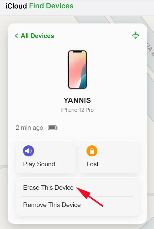 Step 4. When the phone menu appears, click Erase This Device, then confirm it. This wipes the device remotely, removing the passcode.