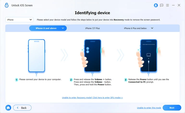 2. Plug the unavailable iPhone into your computer with cable. Then enter it to recovery mode if it isn't recognized by the computer by clicking the link on the screen (see below).