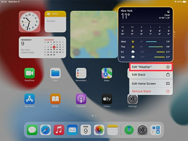 1. Long-press the weather widget on your iPad until a list appears from below. Tap Edit "Weather."