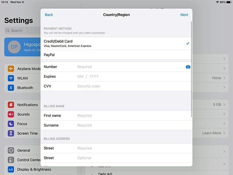 8. Select a payment method for the new country or region. Also, fill out the correct payment information and tap Next.