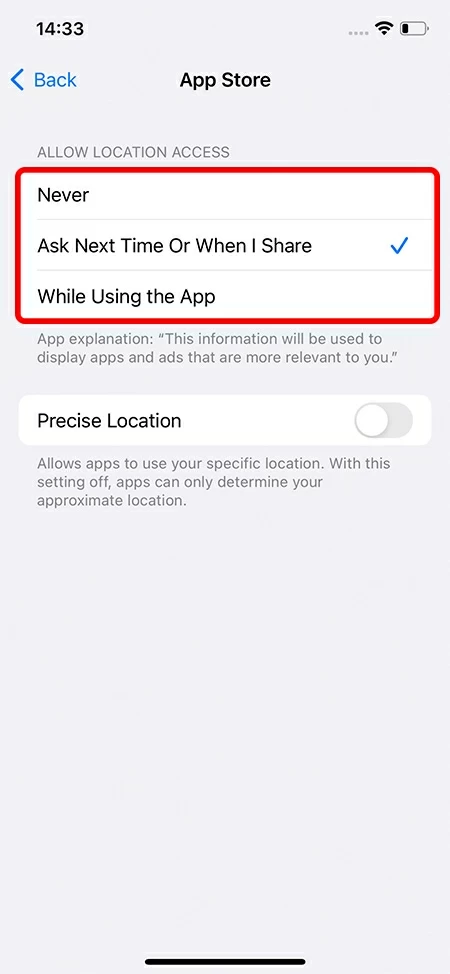 3. Locate the app you want to change the GPS location services, then you will be given three options: Never, Ask Next Time Or When I Share, While Using the App. Select the appropriate option to change the GPS location service according to your needs.