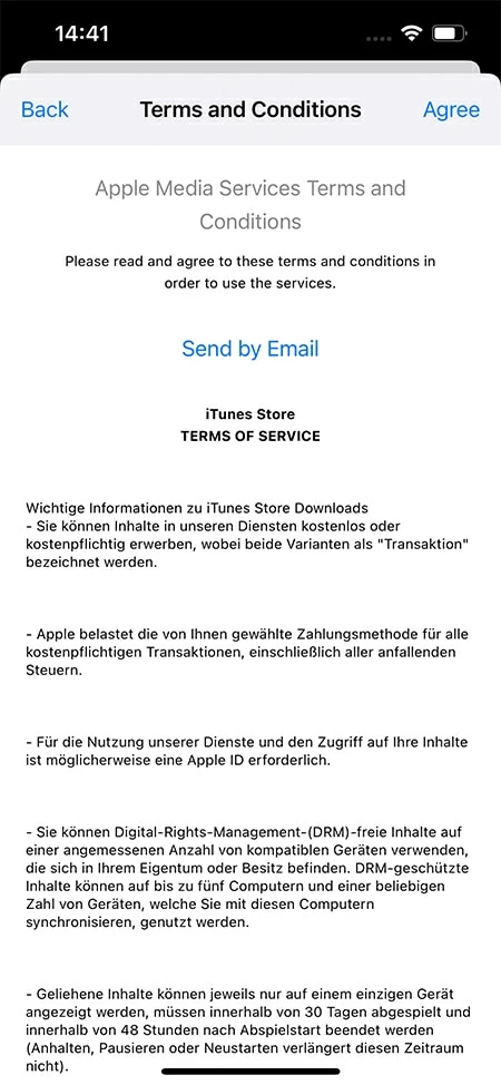 4. Tap Agree in the upper right corner of the next page, and tap Agree again in the pop-up box of Apple Media Services Terms and Conditions.