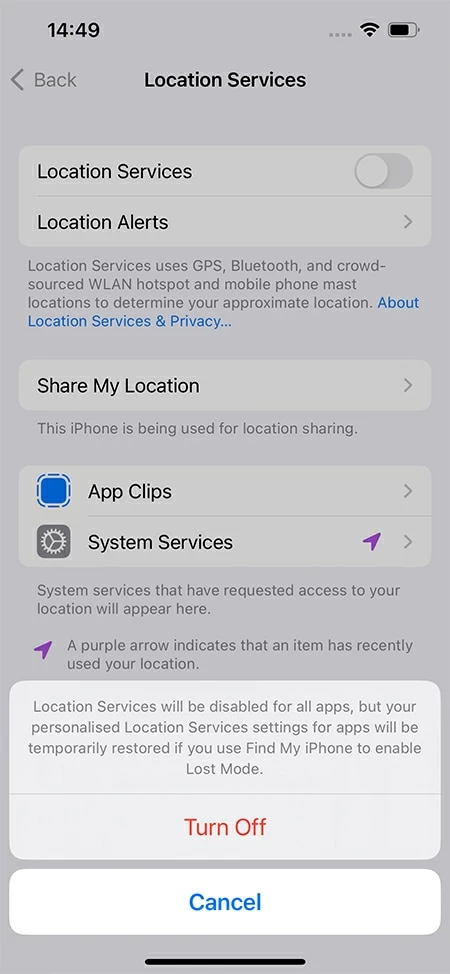 You can turn Location Services on or off in Settings according to your needs. When you turn off Location Services, applications will not know your current location address. If they want to know your real location, they need to send a prompt asking you and get your permission.