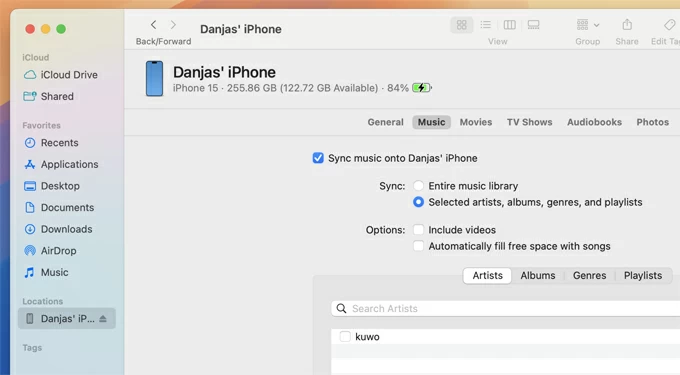 4. In Finder's sidebar, select your iPhone and choose Music tab from the top bar.