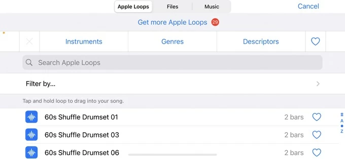 3. Tap the project's loop icon, choose Files, and add the song (must be DRM-free) or recording into an audio track.