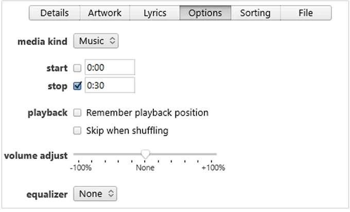 3. Convert your song to AAC and trim to 30 seconds: In iTunes/Finder, right-click the song, choose Song Info > Options, set start and stop times (less than 30 seconds), then create an AAC version.