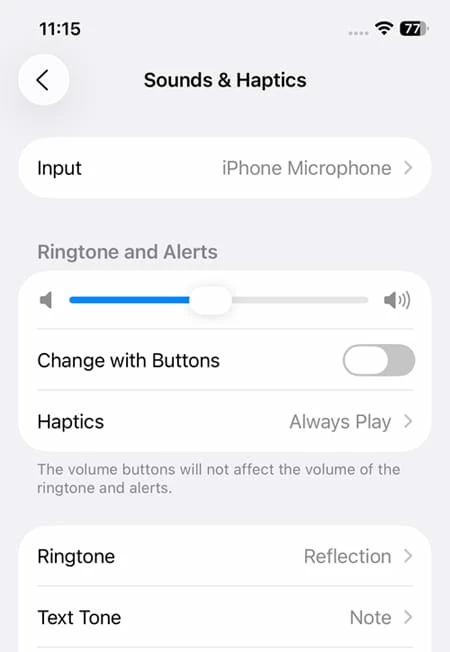 2. Optionally, enable Change with Buttons to allow the physical volume buttons to change ringtone and alert volume when you're not on a call