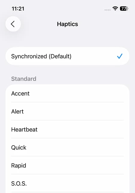 2. Choose a subtle vibration for meeting environments or a strong one for noisy places. You can also turn vibrations off entirely from the Haptics settings on the main Sounds & Haptics screen