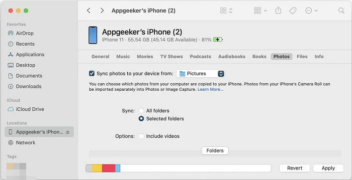 The classic method. If you've already installed iTunes on your PC (macOS comes with Finder by default), the iTunes app is the quickest way to make a transfer. The primary drawback of using iTunes is the process would delete the existing photos already on the iPhone when you sync the new ones.