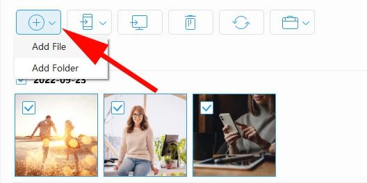 Alternatively, look for the Add button (see below) in the top toolbar of the tool's window and click it. In the drop-down menu, select either Add File or Add Folder. A dialog box will open, prompting you to select the entire folder or individual image files from your computer (the photos you copied from the SD card). Select and click Open.