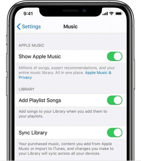 3. Toggle on Sync Library (or iCloud Music Library on older iOS versions).