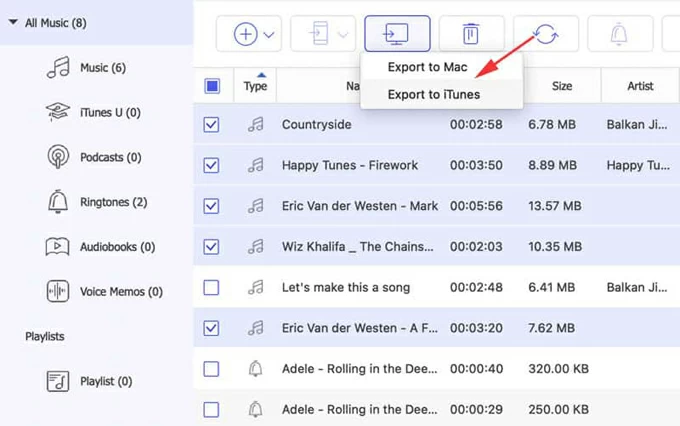 Step 3. Choose a specific album to display all its tracks, then select the songs you want to move to your Mac, click Export to Mac on the toolbar.