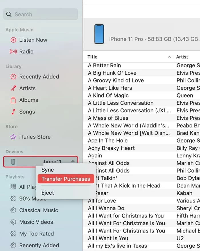 3. From the context-menu, select Transfer Purchases to move purchased items to the Mac.