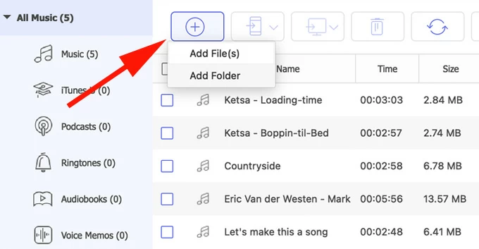 3. Click the Add File(s) or Add Folder button at the top of the music window. Browse your Mac to locate the music files you want to transfer. Select one, multiple files, or the entire folder, then click Open.