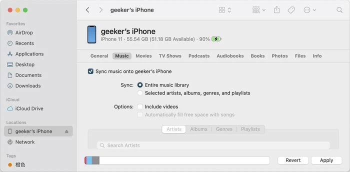 8. Click Apply (or Sync) in the lower-right corner. Finder begins syncing music to your iPhone from Mac. Wait until the progress bar finishes.