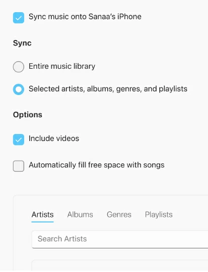5. Check the box for Sync Music, then choose from Entire music library or Selected playlists, artists, albums, and genres.