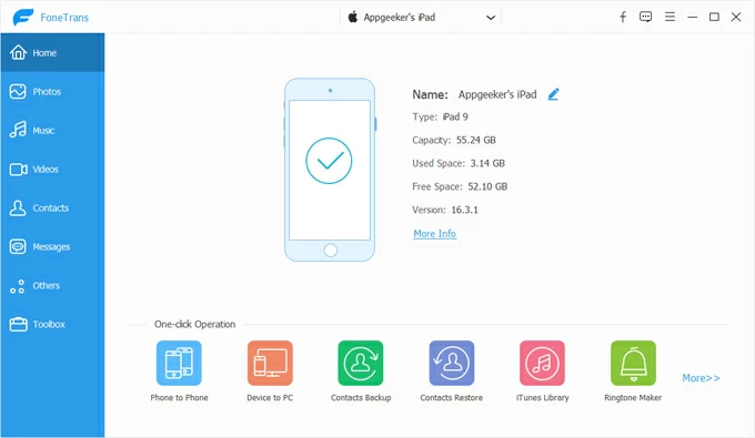 1. Open the iPhone Data Transfer application and connect your iPad. The device will appear in the screen with basic information.