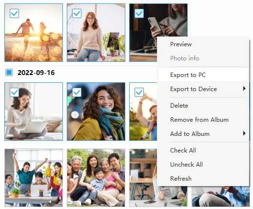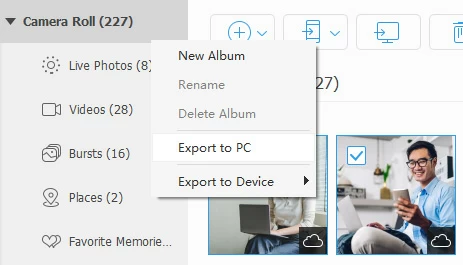 You can also right-click on a specific album, then select Export to PC to import all of the photos inside the album.