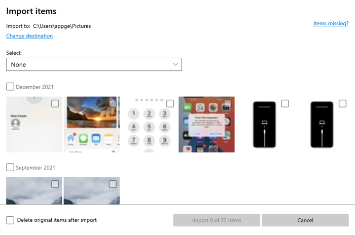 8. Optional: Change the folder location where the photos will be saved on your PC through a "Change destination" or gear icon near the top of the import screen. By default, they will be saved in a subfolder in your Pictures folder, organized by date.