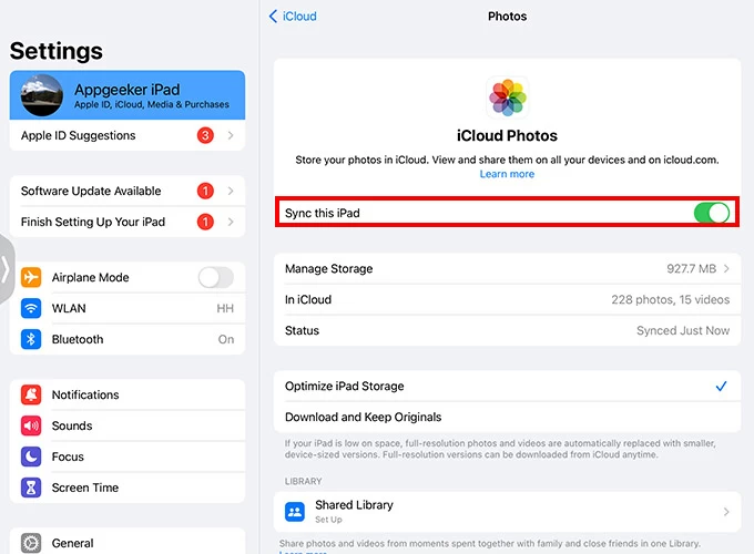 1. Go to Settings > [Your Name] > iCloud > Photos, turn on Sync This iPad.