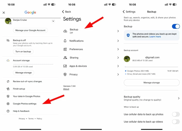 Step 3. Tap your profile icon, then go to Google Photos settings, enable Backup. This uploads all photos and videos from the iPhone into your Google Photos cloud account.