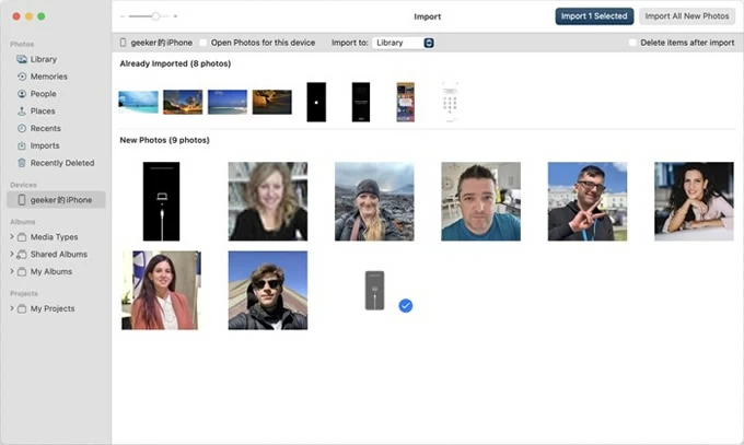 3. Click on your iPhone under Devices in the sidebar, and the Photos app's main window will display all images and videos that haven't been imported yet.