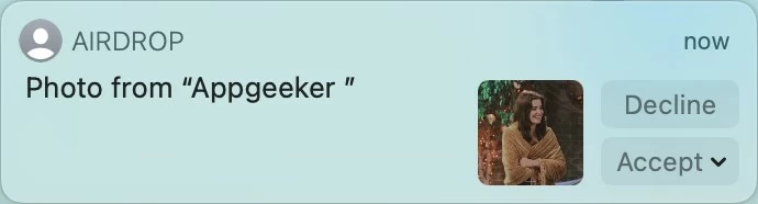 4. Locate the received photos. A small window will pop up on the Mac desktop; click Accept, and the received files will automatically save to the Downloads folder for immediate use.