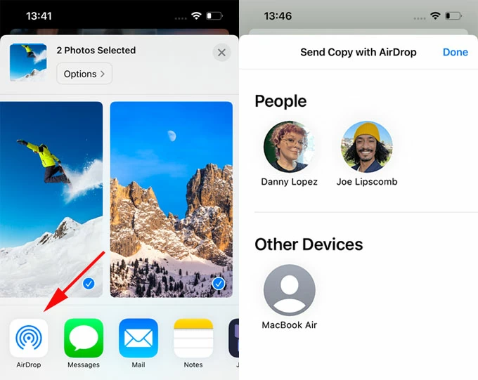 3. Send the photos. On iPhone, open Photos, pick your desired images, tap Share icon at the bottom-left corner, then choose your Mac from the list of available devices.