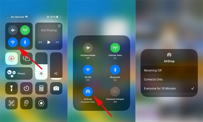 2. Enable AirDrop on iPhone. Swipe down the screen to enter Control Center > long press the Wi-Fi box > tap AirDrop. Choose Contacts Only or Everyone for 10 Minutes.