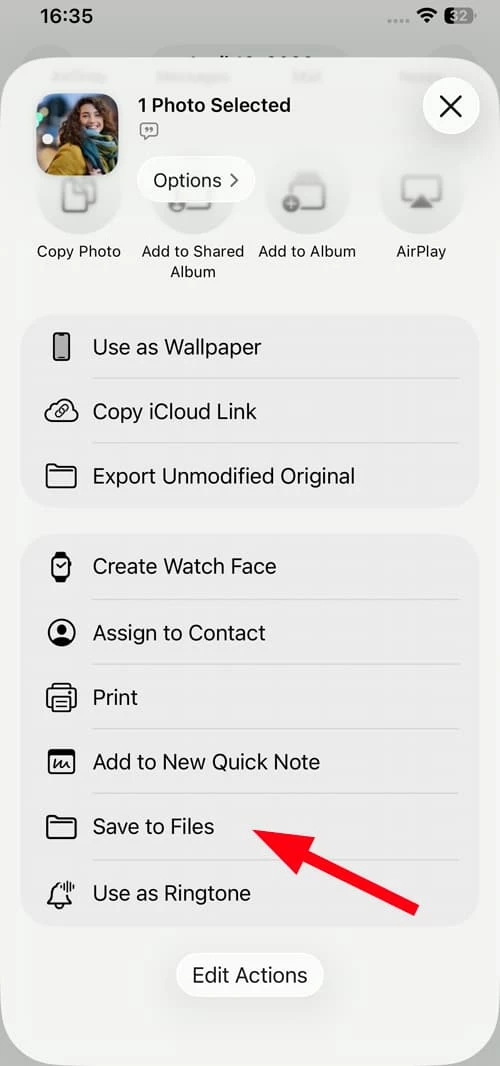 7. In the Share menu, choose Save to Files. Under Locations, your SD card should appear (sometimes labeled as "Untitled" or with the card's name).
