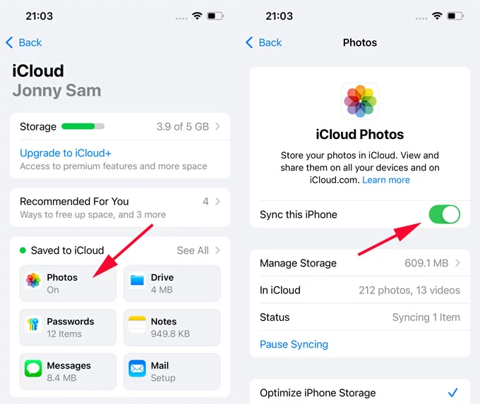Steps to sync photos between old and new iPhones by iCloud Photos: