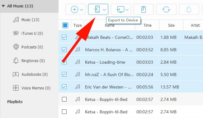3. Select the ringtones you want to transfer, then click Export to Device icon on the top menu.