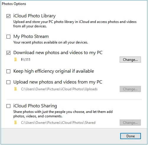 4. Enable iCloud Photos Library and Download new photos and videos to my PC options.