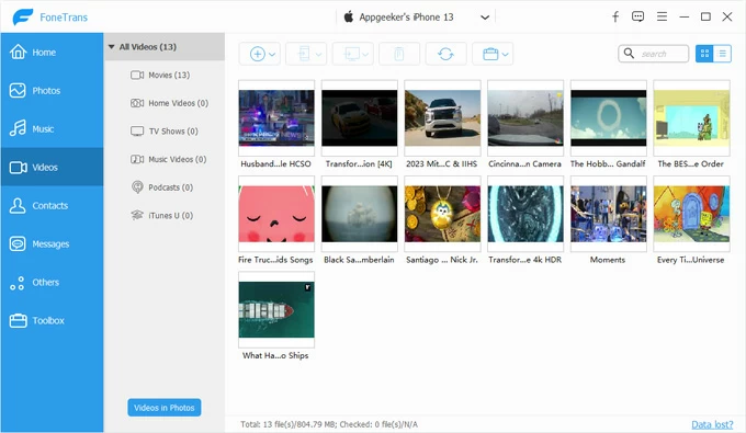 2. Then click Videos in the left sidebar. All your existing video files in the iPhone should display and be sorted by different types: Movies, Home Videos, TV Shows, Music Videos, etc.