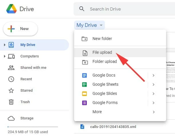 2. Head to New > File upload in the top-left corner of the Google Drive page to upload your videos; or click and drag the video file from your computer's folder directly into the Google Drive page.
