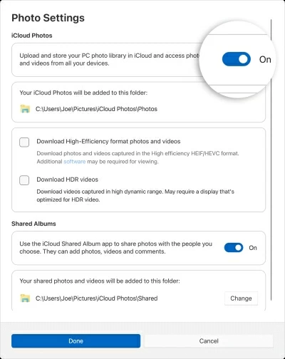4. Copy videos into the iCloud Photos folder on your PC. (You should remember the default path of the folder in Photos Settings, see below).