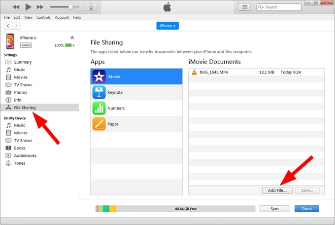 5. For storing playable files without re-encoding, use a media app (e.g., VLC). Go to File Sharing, select VLC, drag and drop the video files into the app's Documents area, and they will appear in VLC on your iPhone. Alternatively, import videos to iPhone by using Add File button at the bottom.