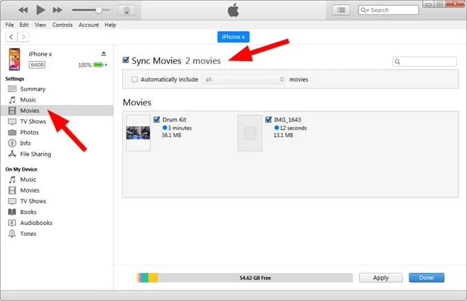4. To add to Photos library, use the Photos sync tab instead: enable Sync Photos, choose a folder on your PC that contains the videos, then click Apply. Videos in that folder will be imported to the iPhone Photos app.